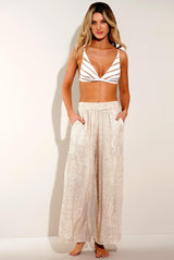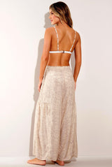 - Off white pants with animal print. You will never feel more feminine with this comfortable smocked waistband pants. The pants are high rise and have side pockets with details on the sides. Made in Colombia