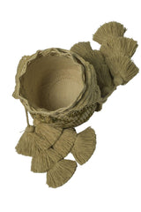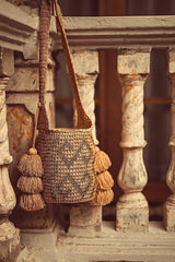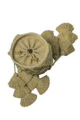 This bag was made by indigenous artisans in the northeast of Colombia, La Guajira. It has gold thread figures across the bag. The basket closes inside with drawstring featuring pompoms on each side. It was inspired by ancient techniques passed down over hundreds of years, using the fine crochet technique. The basket was made by an association of 130 women, located in Sandona, Narino, Colombia.