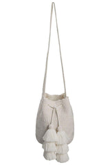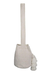 This medium size mochila bag was made by indigenous artisan in the northeast of Colombia, La Guajira, Inspire in ancient techniques passed down over million of years, using the fine crochet technique. It is white with closure in front and tassel pom-poms.