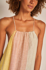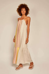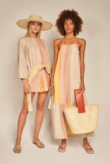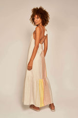 - Linen long dress in beige. The dress has a loose fitting with thin straps and crosses in the back. This women's dress has pink and yellow touches. Designed and made in Colombia